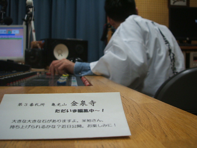 さて、「きくへんろ。」は、主に夜、つくられます。ワタクシ、実は「拝、ボーズ!!」「きくへんろ。」のみの担当ではないものですから、日中は、電話連絡とか取材とか、「対人間」の仕事をいろいろやっております。そうなると、「対ミキサー卓」「対パソコン」という番組編集作業は、自動的に皆さま寝静まった夜、ということになるわけです。