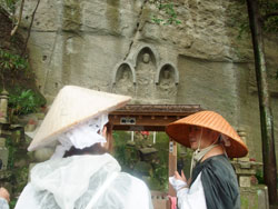 本堂でのお参りを修めた一行は、眼下に町を見渡す山の岩肌に刻まれた、