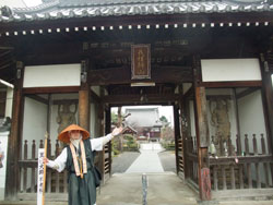 朝一番の曼荼羅寺の門前、凛々しいお遍路姿で立つ次男クン。