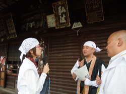 が一行を迎えてくれます。境内へ入ると、歴史を感じさせる壁に、白い線が五本。